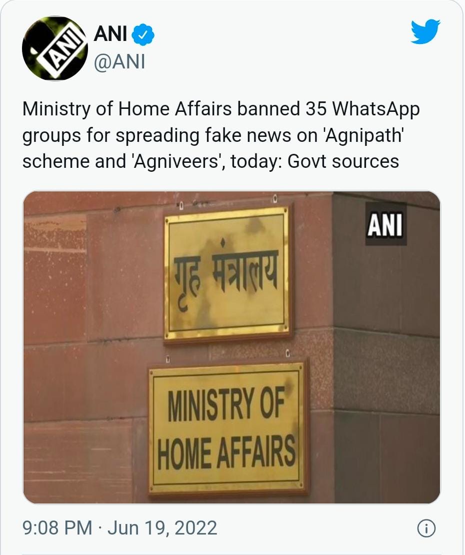 अग्निपथ योजना के बारे में अफवाह फैलाने वाले 35 व्हॉट्सएप ग्रुप्स को प्रतिबंधित