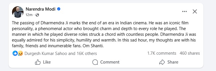 बताया गया कि हाल ही में 12 नवंबर को वह अस्पताल से डिस्चार्ज होकर घर लौटे थे और वहीं उनका इलाज जारी था। पंजाब के साहनेवाल में जन्मे धर्मेंद्र ने 65 वर्षों के करियर में 300 से अधिक फिल्में कीं और हिंदी सिनेमा को कई यादगार भूमिकाएं दीं। उनके घर के बाहर अमिताभ बच्चन, अभिषेक बच्चन, आमिर खान और ईशा देओल सहित कई हस्तियां पहुंची हैं।
