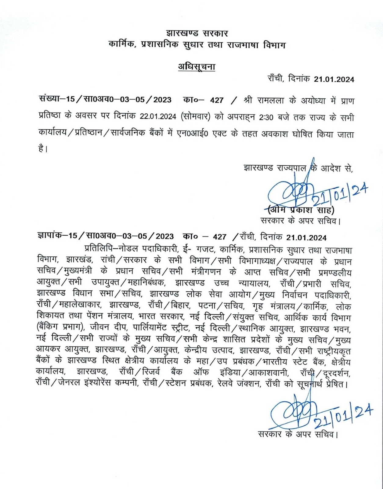 मुख्यमंत्री हेमंत सोरेन ने दिया निर्देश, रामलला के प्राण-प्रतिष्ठा को लेकर सभी सरकारी कार्यालयों को 2:30 बजे तक सरकारी स्कूलों को पुरे दिन के लिए रखा जायेगा बंद