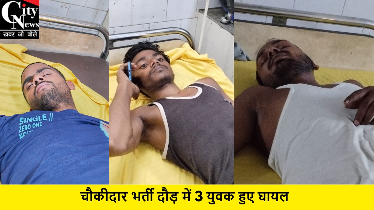 चौकीदार भर्ती दौड़ में 3 युवक घायल हो गए है। चौकीदार भर्ती की यह दौड़ पपरवाटांड़ स्टेडियम में हो रही है। सरिया के मंटू कुमार राय और देवरी के उज्ज्वल मिश्रा व महेश कुमार राय को सदर अस्पताल लाया गया है।