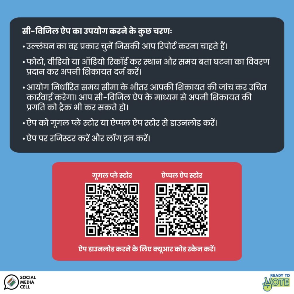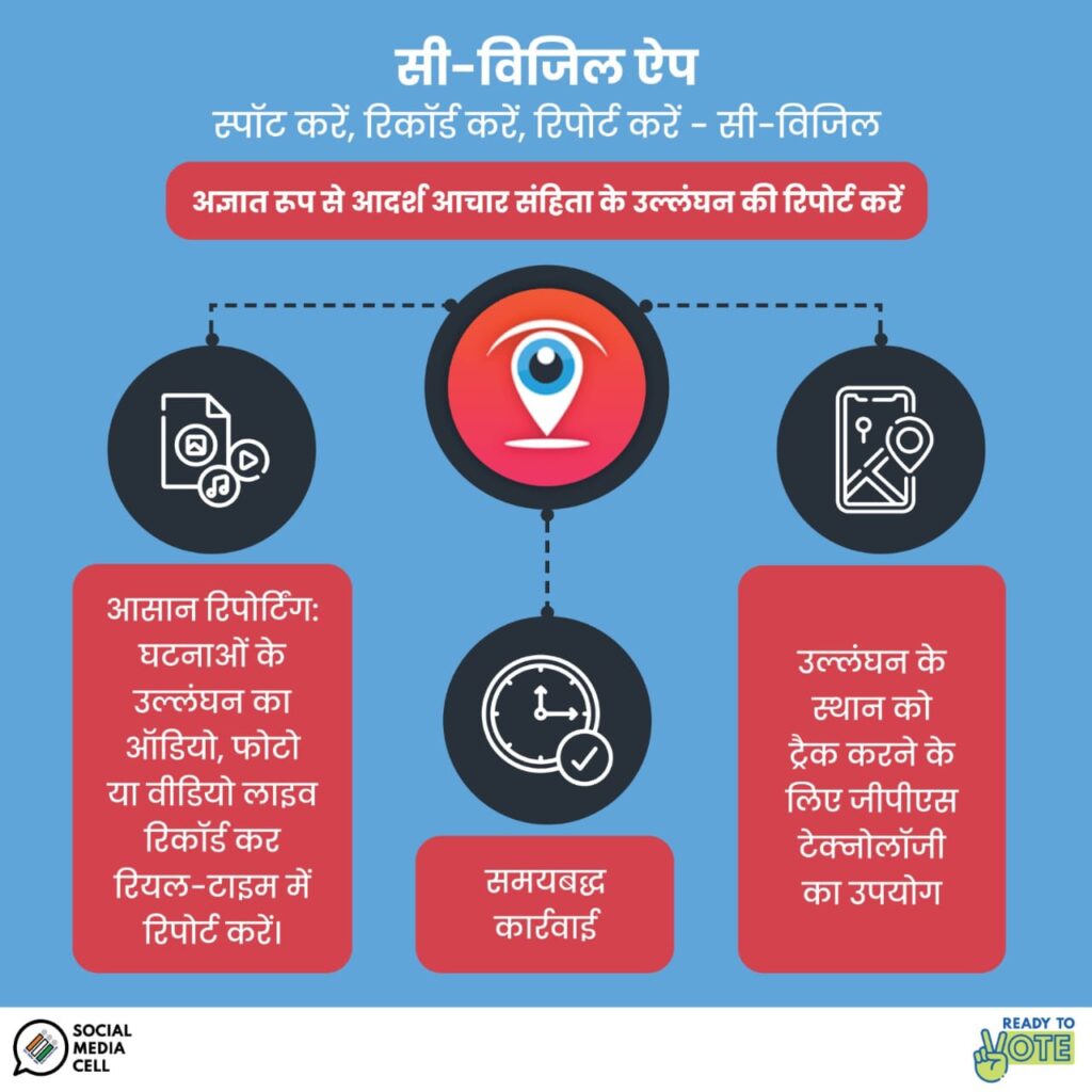 बता दें कि सी-विजिल ऐप के माध्यम से नियमों का उल्लंघन करने वाले नेताओं और कार्यकर्ताओं की शिकायत हो सकती है। इसके अलावा आप चुनाव आयोग एवं जिला निर्वाचन पदाधिकारी को किसी भी विभाग के अधिकारी/कर्मी जो अपने कर्तव्य एवं दायित्वों के विरूद्ध कुछ भी गलत या नियमों का उल्लंघन करता है, तो आप उसकी भी शिकायत कर सकते हैं।