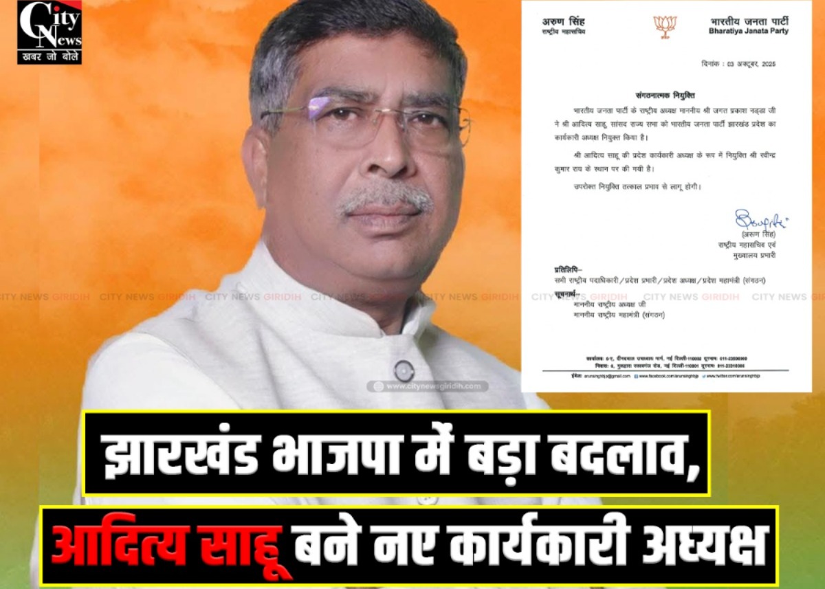 भारतीय जनता पार्टी ने झारखंड प्रदेश संगठन में अहम बदलाव करते हुए राज्यसभा सांसद श्री आदित्य साहू को प्रदेश का नया कार्यकारी अध्यक्ष नियुक्त किया है। यह घोषणा पार्टी के राष्ट्रीय अध्यक्ष जगत प्रकाश नड्डा ने 03 अक्टूबर 2025 को की।