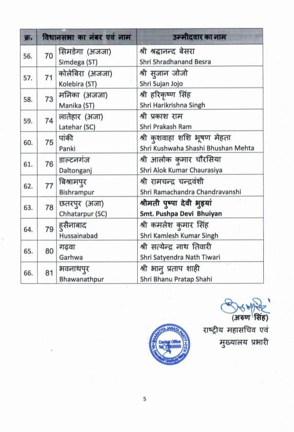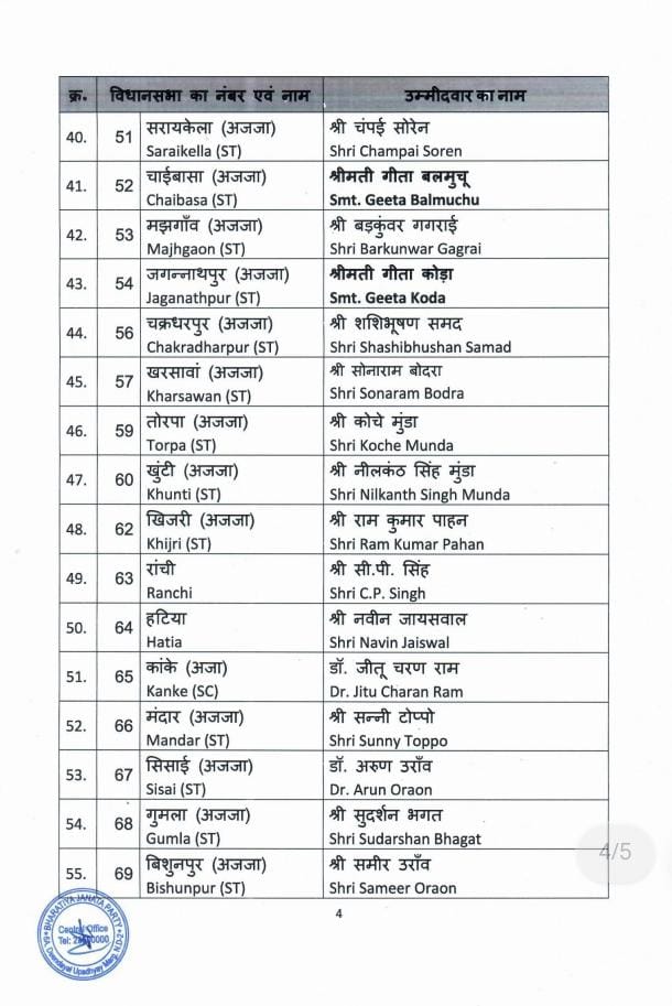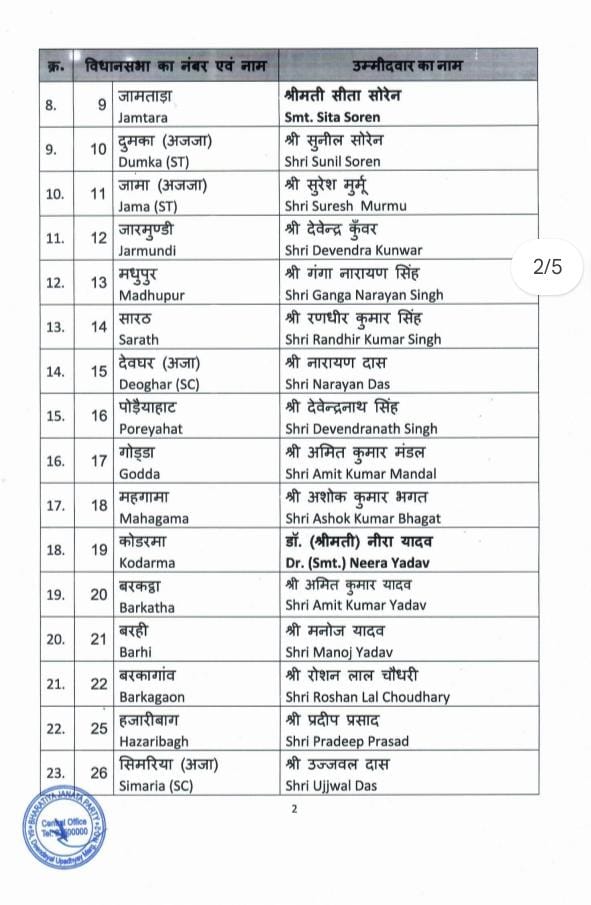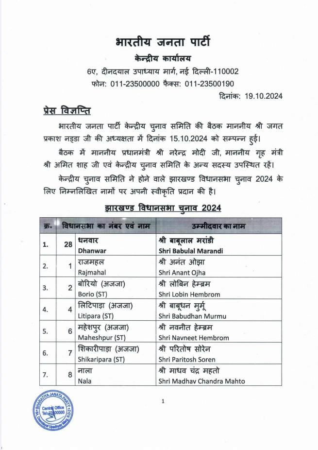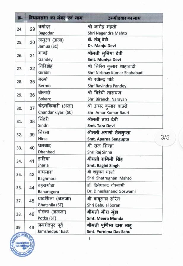 भाजपा की ओर से झारखंड में प्रत्याशियों को लेकर अधिकारिक घोषणा शुरू हो गई है। केंद्रीय कार्यालय ने शनिवार को भाजपा उम्मीदवारों की पहली सूची जारी की। इस सूची के मुताबिक गिरिडीह सीट से पूर्व विधायक निर्भय शाहाबादी चुनाव लड़ेंगे। वही गांडेय सीट से भाजपा की ओर से मुनिया देवी चुनाव मैदान में उतरेगी। इसी तरह प्रदेश अध्यक्ष बाबूलाल मरांडी राजधनवार सीट से चुनाव लड़ेंगे तो नागेंद्र महतो बगोदर सीट से मैदान में लड़ेंगे।