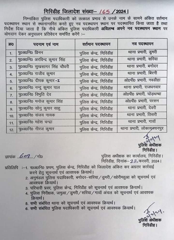 गिरिडीह के कई पुलिस पदाधिकारी को पदस्थापित किया गया है और वर्तमान पदस्थापन स्थान से स्थानान्तरित करते उन्हें नए स्थान पर पदस्थापित कर दिया गया है। इस मामले में अधिसूचना जारी कर पुलिस पदाधिकारी और नव पदस्थापन स्थान की सूचि भी जारी कर दी गयी है जिसमे किनका कहां तबादला किया गया है इसकी पूरी जानकारी दी गयी है। देखें सूची :-