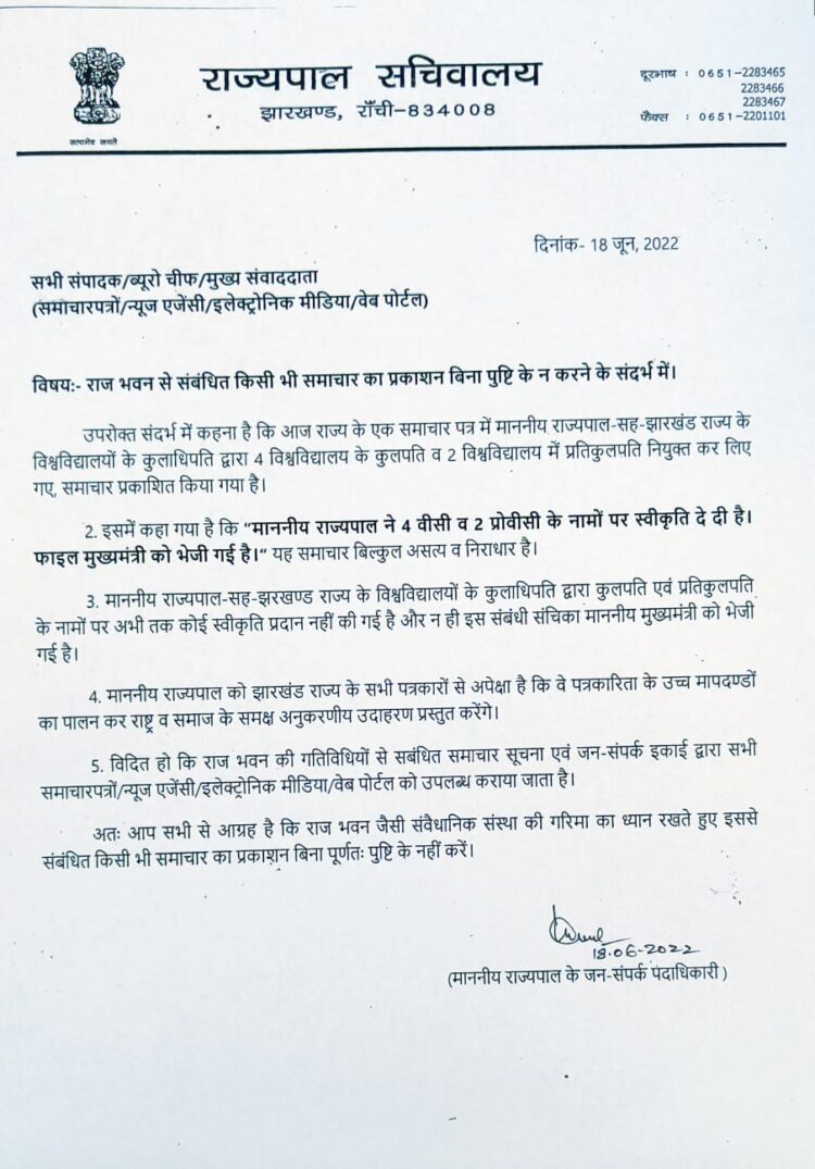 झारखंड के एक समाचार पत्र में विश्वविद्यालयों के कुलाधिपति द्वारा 4 विश्वविद्यालय के कुलपति व 2 विश्वविद्यालय में प्रतिकुलपति नियुक्त करने की खबर छापी गयी थी। इसमें कहा गया है कि “माननीय राज्यपाल ने 4 वीसी व 2 प्रोवीसी के नामों पर स्वीकृति दे दी है। फाइल मुख्यमंत्री को भेजी गई है।” यह समाचार बिल्कुल असत्य व निराधार है। बताया गया की माननीय राज्यपाल-सह-झरखण्ड राज्य के विश्वविद्यालयों के कुलाधिपति द्वारा कुलपति एवं प्रतिकुलपति के नामों पर अभी तक कोई स्वीकृति प्रदान नहीं की गई है और न ही इस संबंधी संचिका माननीय मुख्यमंत्री को भेजी गई है। राज्यपाल ने सभी पत्रकारों से आग्रह किया है की राज भवन की गतिविधियों से सबंधित समाचार सूचना एवं जन-संपर्क इकाई द्वारा सभी समाचारपत्रों/न्यूज एजेंसी/इलेक्ट्रोनिक मीडिया/वेब पोर्टल को उपलब्ध कराया जाता है। इसलिए राज भवन जैसी संवैधानिक संस्था की गरिमा का ध्यान रखते हुए इससे संबंधित किसी भी समाचार का प्रकाशन बिना पूर्णतः पुष्टि के नहीं करें।