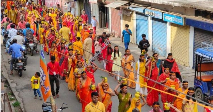 गिरिडीह के बाभनटोली हनुमानगढ़ स्थित महावीर मंदिर परिसर से सोमवार को कलश यात्रा निकाली गयी. महावीर मंदिर परिसर में नवनिर्मित राम जानकी और लक्ष्मी नारायण की प्राण प्रतिष्ठा को लेकर निकली इस कलश यात्रा में 251 महिलाएं और बेटियां सिर पर कलश लिए शामिल हुईं. दोनों मंदिर के पांच दिवसीय प्राण प्रतिष्ठा कार्यक्रम के पहले दिन ही शहर में निकली कलश यात्रा की अगुवाई बैंड पार्टी कर रही थी. जिसके धुन में प्राण प्रतिष्ठा कार्यक्रम समिति के युवा सदस्य कई भजनों पर नृत्य करते चल रहे थे. कलश यात्रा में भाजपा नेता बाबुल गुप्ता, विश्वनाथ स्वर्णकार, आनंद सिंह, संजय मोदी, निरंजन गुप्ता, विजय शाहा, ललन खटीक, सुभम सिंह, बिकास गुप्ता, योगेश यादव, आदर्श केशरी, श्रीकांत वर्मा समेट काफी संख्या में श्रद्धालु शामिल हुए.