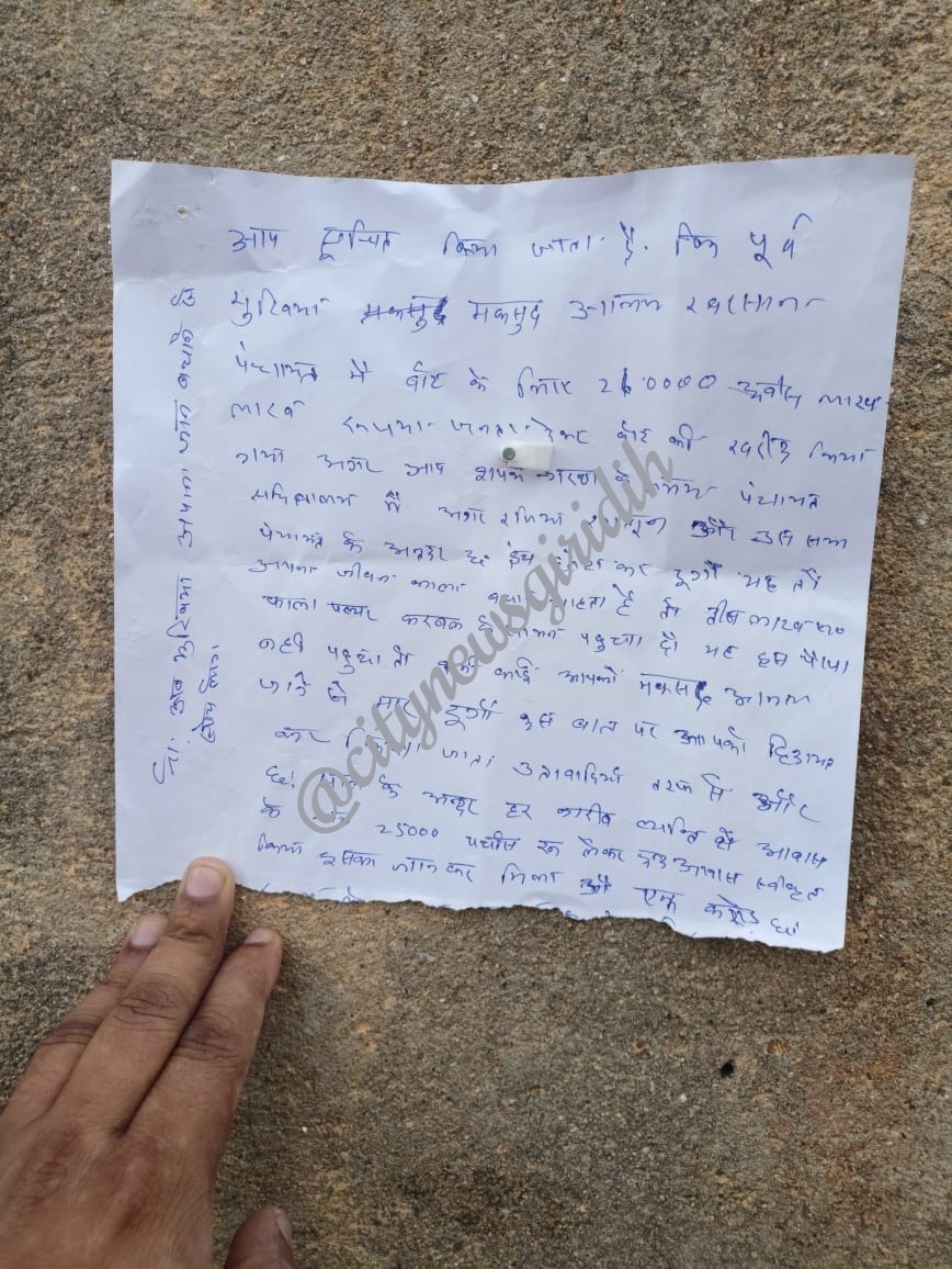 चिपकाए गए कागज में लिखा हुआ है की पंचायत सचिवालय में रजिया खातून को छह इंच छोटा कर दूंगा या तो अपना जीवन काल बचाना है तो तीस लाख रुपए काला पत्थर करबला के सामने पहुंचा दें नहीं तो कभी भी मकसूद आलम को जान से मार दूंगा।