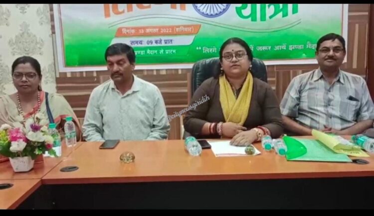 भाजपा नेत्री शालिनी वेसखियार अपने सहयोगियों के साथ गुरुवार को नया परिसदन भवन में प्रेस वार्ता की और तिरंगा यात्रा को लेकर जानकारी दी।बताया गया कि गिरिडीह में सामाजिक संगठनों द्वारा आज़ादी के अमृत महोत्सव के अंतर्गत 13 अगस्त को 75 मीटर तिरंगा के साथ यात्रा निकाली जाएगी। तिरंगा यात्रा का नेतृत्व कर रही भाजपा नेत्री शालिनी वैशख्यिर ने बताया गया कि आज़ादी के 75 वां वर्ष पुरे होने के उपलक्ष में सभी आज़ादी का अमृत महोत्सव मना रहे है।