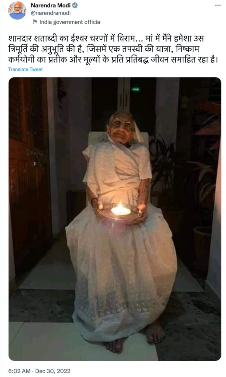 पीएम ने लिखा, शानदार शताब्दी का ईश्वर चरणों में विराम… मां में मैंने हमेशा उस त्रिमूर्ति की अनुभूति की है, जिसमें एक तपस्वी की यात्रा, निष्काम कर्मयोगी का प्रतीक और मूल्यों के प्रति प्रतिबद्ध जीवन समाहित रहा है.