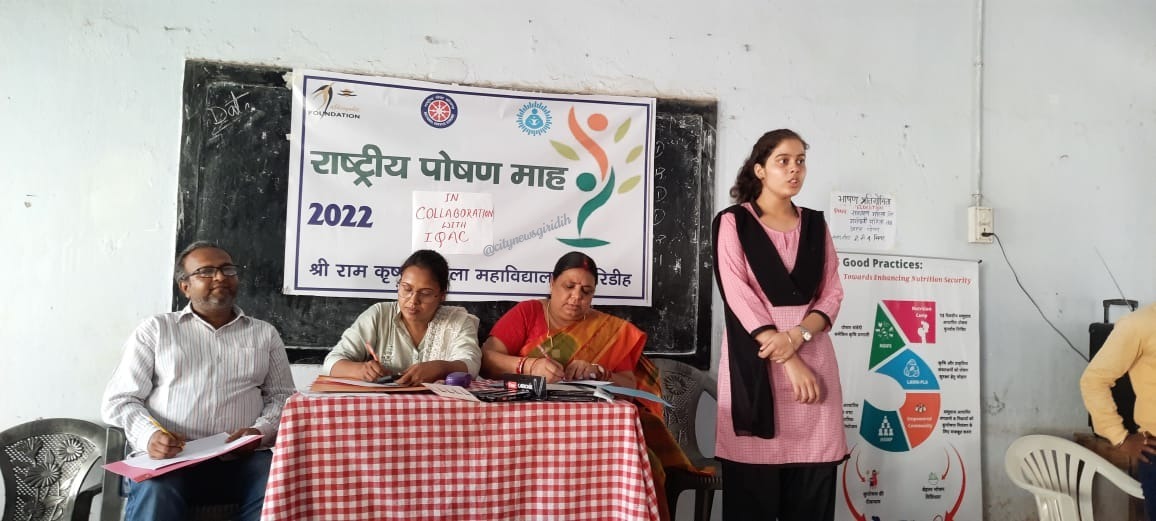 शहर के आर के महिला कॉलेज के एनएसएस इकाई एक व दो तथा IQAC और अभिव्यक्ति फाउंडेशन के संयुक्त तत्वाधान में शनिवार को पोषण सप्ताह मनाया गया। इस अवसर पर विभिन्न प्रतियोगिताएं भी आयोजित किये गए।जिसके बाद विजेता प्रतिभागियों को पुरस्कृत भी किया गया।बताया गया कि प्रतियोगिता में पोषण थाली सजाओ में चित्रा प्रथम,खुशी द्वितीय तथा अल्जिना तृतीय रही।इधर
