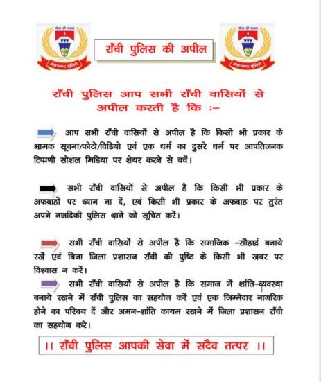 रांची पुलिस ने रांची की आम जनता से अपील की है जिसमे उन्होंने किसी भी प्रकार के भ्रामक सुचना/फोटो/वीडियो/ एवं एक धर्म का दूसरे धर्म पर आपत्तिजनक टिप्पणी सोशल मिडिया पर शेयर करने से बचने को कहा है। साथ ही उन्होंने यह भी अपील की है की जनता किसी भी प्रकार के अफवाहों पर ध्यान न दें। एवं किसी भी अफवाह पर तुरंत अपने नजदीकी पुलिस ठाणे को सूचित करें। सामाजिक सौहाद्र बनाएं रखें एवं इना जिला प्रशासन रांची की पुष्टि के किसी पर विश्वास न करें। उन्होंने यह भी कहा की शहर में शांति व्यवस्था कायम रखने में पुलिस का सहयोग करें।