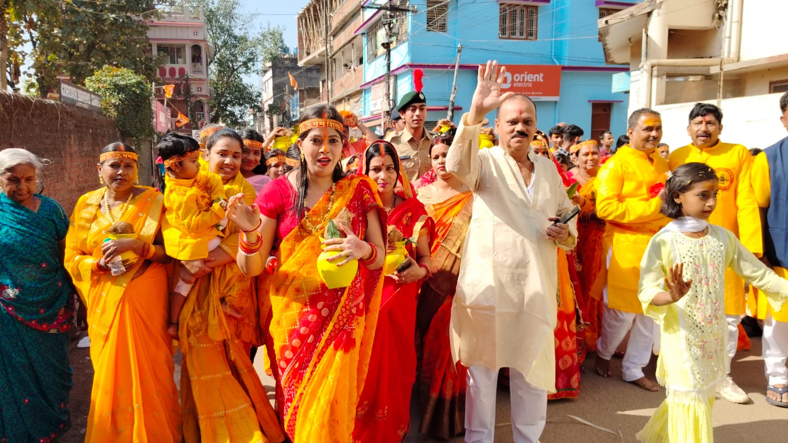 गिरिडीह शहर के ह्रदयस्थली बरमसिया में नवनिर्मित श्री मृत्युंजय शिव मंदिर के चार दिवसीय अनुष्ठान की शुरूआत मंगलवार को कलश यात्रा के साथ शुरु हो गया। हज़ारों की संख्या में महिला पुरुष इस कलश यात्रा में शामिल हुए। कलश यात्रा की शुरुआत बरमसिया शिव मंदिर से हुई जो साईं मंदिर,मकतपुर, कालीबाड़ी,टॉवर चौक होते हुए अरगाघाट नदी पर पहुँची। इस कलश यात्रा में गिरिडीह के निवर्तमान विधायक निर्भय कुमार शाहाबादी की ओर से मकतपुर रानीलक्ष्मी बाई स्कूल के पास सभी श्रद्धालुओ पर जय श्रीराम, हर हर महादेव के गुंजायमान नारो के साथ पुष्प वर्षा की गई। इस अवसर पर निर्भय कुमार शाहाबादी ने कहा कि सनातनी परंपरा में इस कार्य का अतिमहत्वपूर्ण स्थान है।दैविक अनुष्ठानों से जहाँ हमारी आत्मा की शुद्धि होती है, वही ऐसे कार्यो में सेवा प्रदान करने से मन तृप्त और शुद्धता बनी रहती है। अनादि काल मे भी हमारे ऋषि मुनि भी इस सृष्टि में उत्तपन्न सभी प्राणियों की सुरक्षा और सृष्टि पर ईश्वर की कृपादृष्टि बनी रहे। मौके पर वैभव शाहाबादी,कोडरमा सांसद प्रतिनिधि दिनेश यादव,ज़िला भाजपा उपाध्यक्ष संजय सिंह,नगर अध्यक्ष हरमिंदर सिंह बग्गा,दीपक स्वर्णकार, पवन शर्मा, हबलु गुप्ता, दीपक शर्मा,ओमप्रकाश गुप्ता,प्रकाश दास,सुरेश गुप्ता, बीरेंद्र वर्मा,दीपक स्वर्णकार आदि उपस्थित थे।